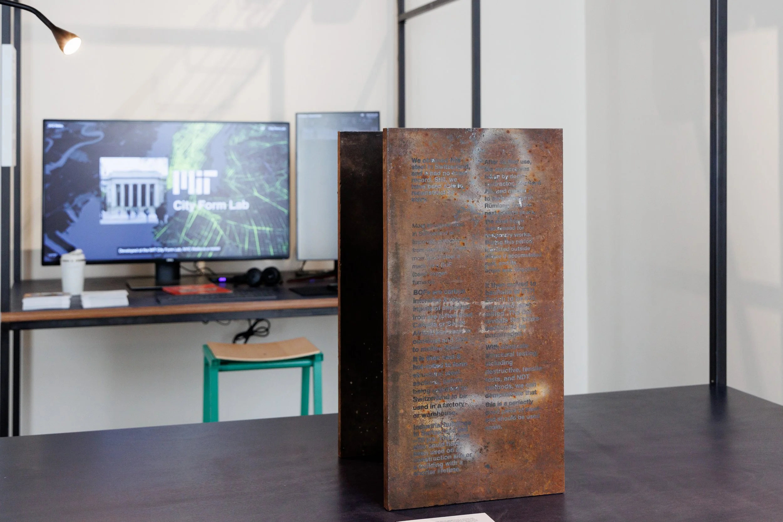 A stele/stela, in the ancient world, was an upright stone or wooden slab, with an inscription or design, communicating a boundary, waypoint, law or decree, commemoration, or sacred marker. Stelae have served as rich sources of information about that time period, and famous stelae include the Rosetta Stone, and the Code of Hammurabi. In a modern context, the most prominent construction materials in urban environments are primarily steel and concrete, as opposed to stone and wood. We don’t often acknowledge or document the information and impact end-of-life steel elements contain. This steel stele captures that story.